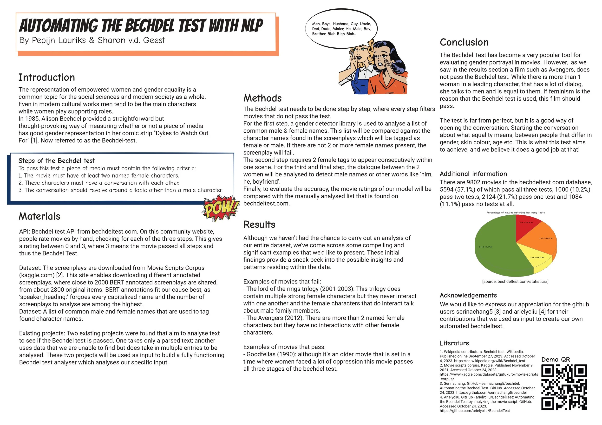 For a Natural Language Processing course, We built an automated pipeline to evaluate movie screenplays using the Bechdel Test. Using annotated script data and name-based gender detection, the system identifies named female characters, detects conversations between them, and analyzes dialogue content to determine whether discussions revolve around men. The project explores how NLP can be applied to social science questions like gender representation in media, and compares model outcomes with human-rated BechdelTest.com results.